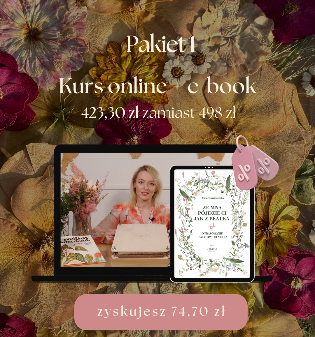 Kurs online przeprowadzi Cię przez proces prasowania kwiatów i zwizualizuje Ci poszczególne kroki, a e-book (link do produktu w nowej karcie) uzupełni i usystematyzuje Twoją wiedzą i pozwoli Ci ją mieć przy sobie w telefonie nawet podczas spaceru po łące.